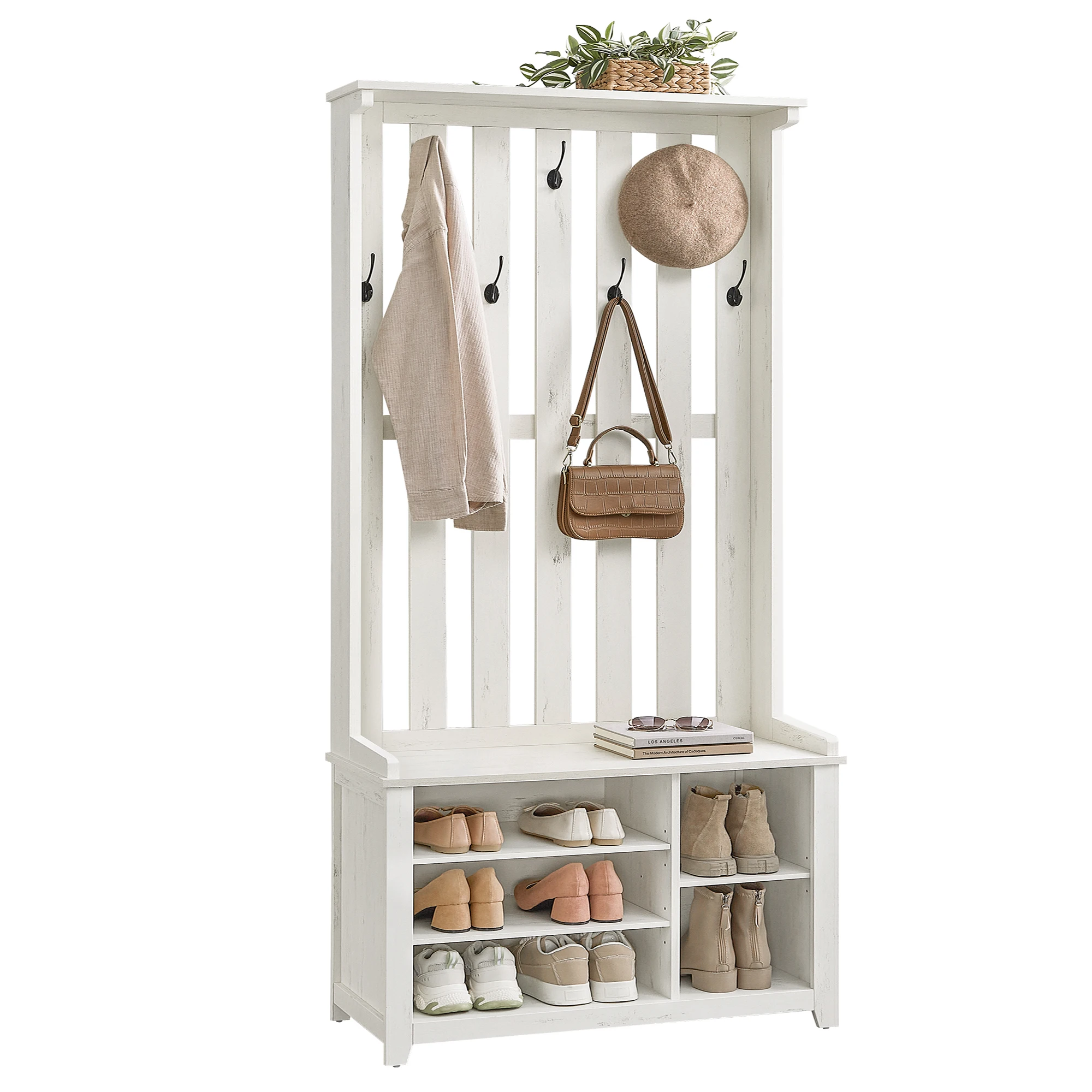 VASAGLE coat rack, dresses stand, shoe bench, wardrobe, jackets stand with shelf, 7 double hooks for jackets, hats, hallway