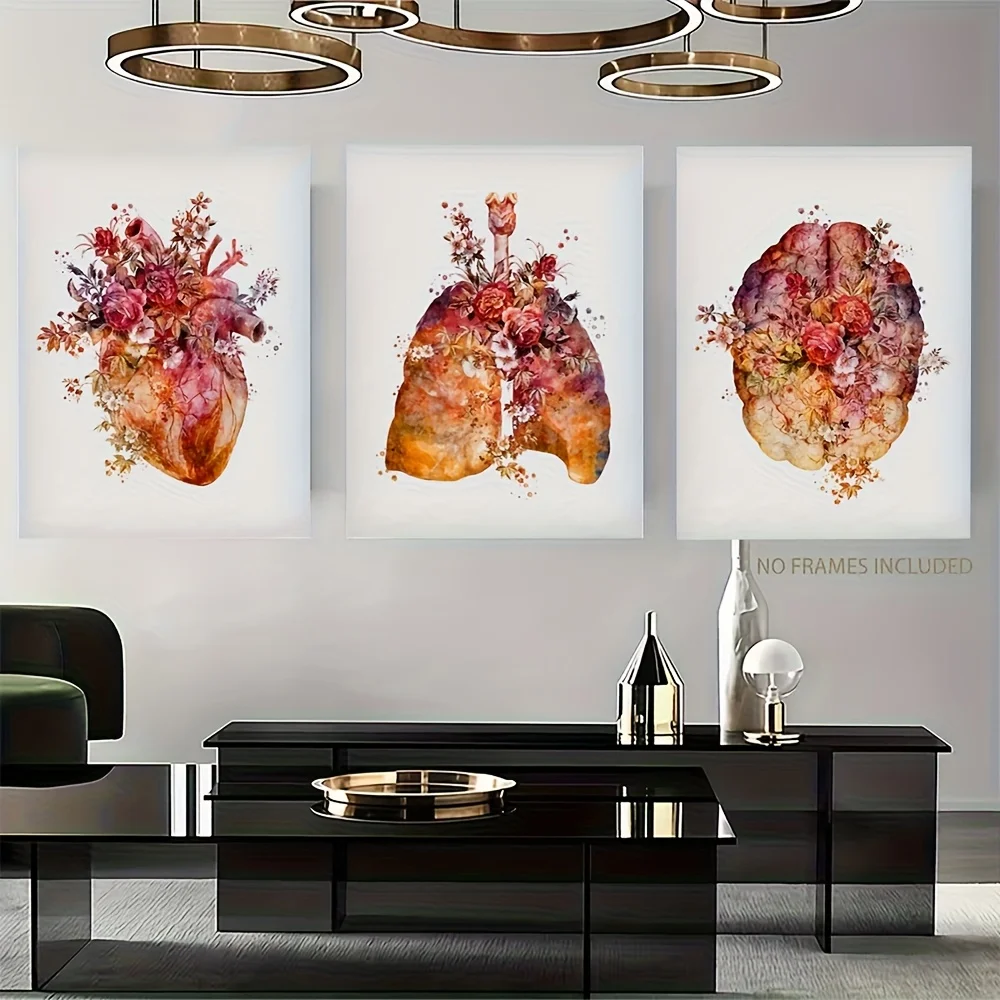2D Flat, 3pcs Anatomy - Watercolor Human Body Charts (Flowers/Heart/Brain) - Frameless Bohemian Prints Suitable for Living Room,