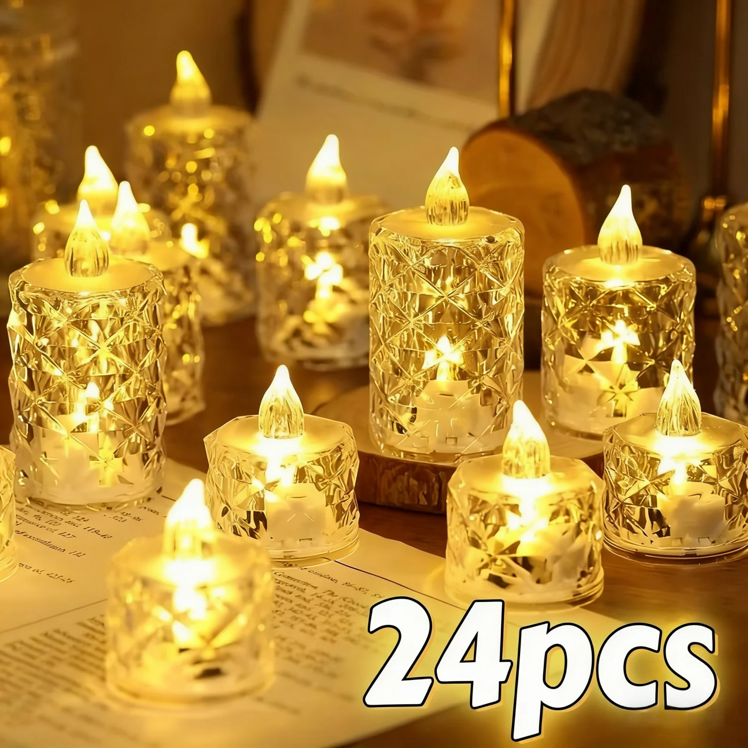 4/24pc Crystal Flameless LED Candles Plastic Battery TeaLight with Realistic Flame for Home Holiday Wedding Party Tabletop Decor