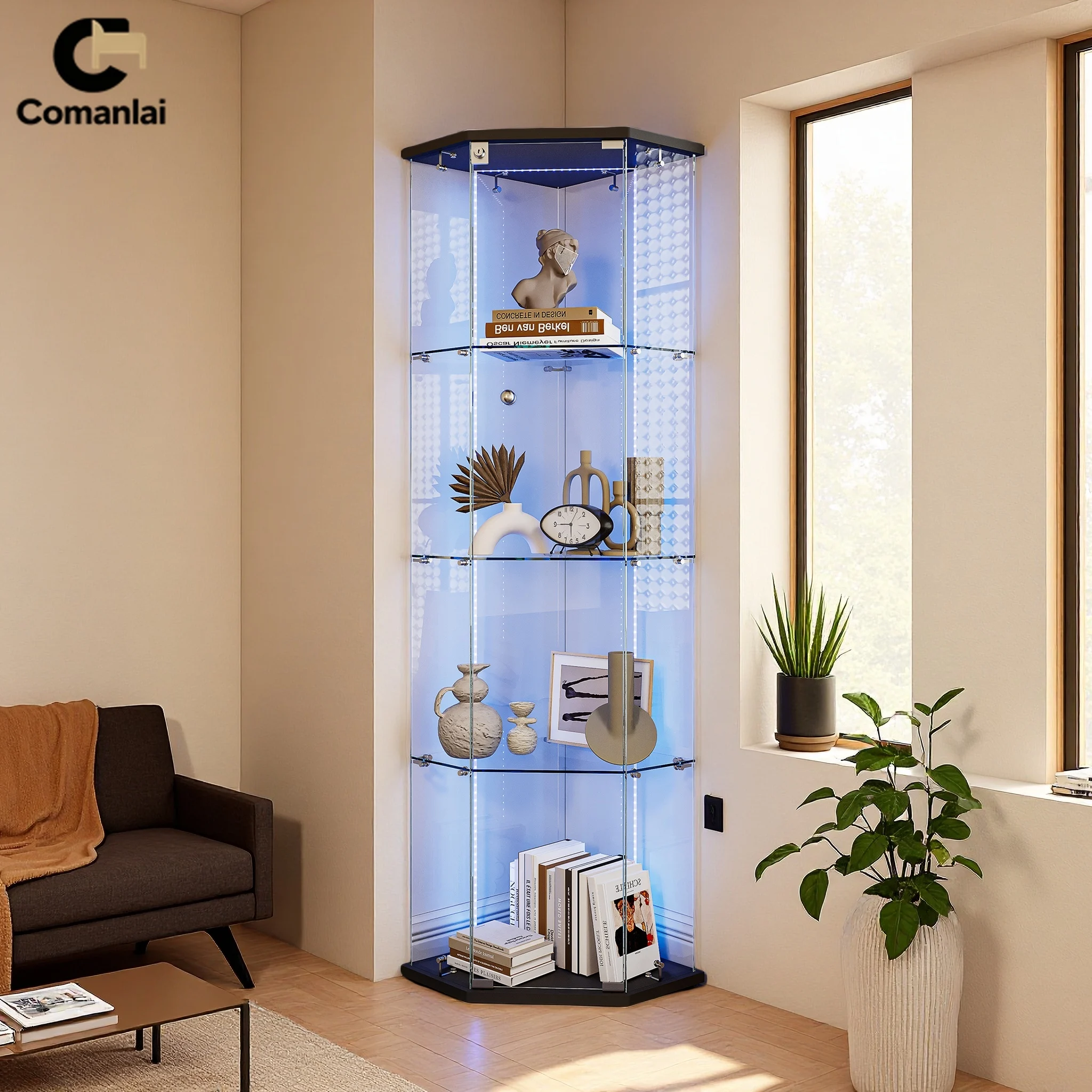Comanlai 4 Layer Vertical Corner Decorative Shelves with LED Light & Door & Lock Freestanding Glass Display Cabinet Room Decor