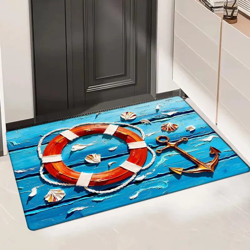 1pc Flannel Non-Slip Thickened Sponge Mat, Ocean-Themed Artistic Floor Decor with Lifebuoy and Moor Design, Suitable fo