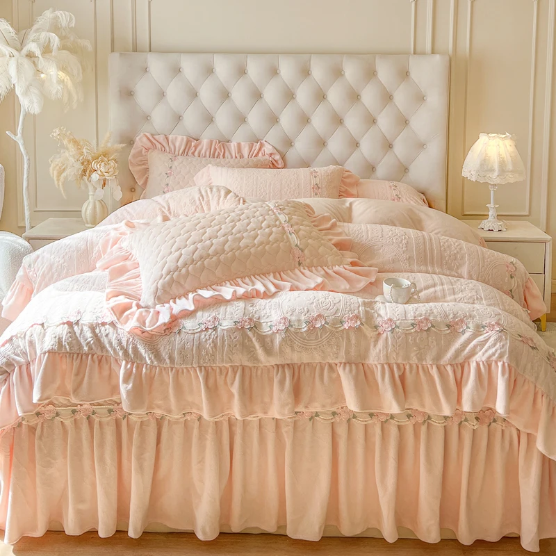 4Pcs Flowers Lace Ruffles Carved Velvet Warm Thickened Winter Princess Bedding Set Duvet Cover Quilted Bedspread Pillowcases