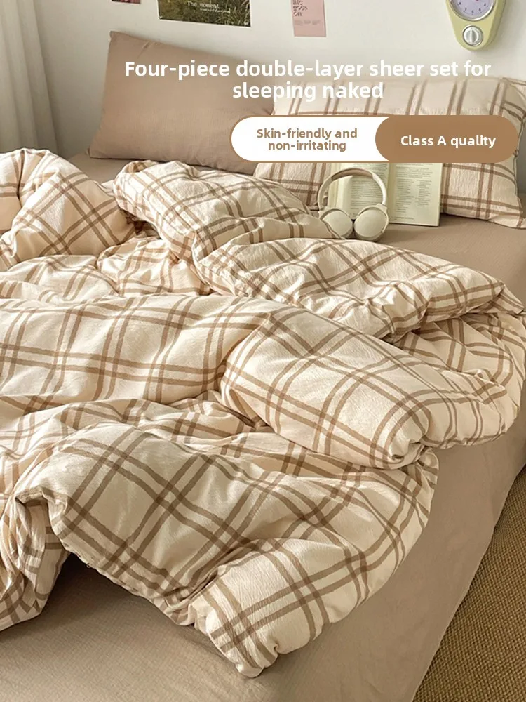 Washed Cotton A-Class Double Layered Bedding Set Student Dormitory Three-Piece Set Simple Style Four-Piece Set Soft Fabric