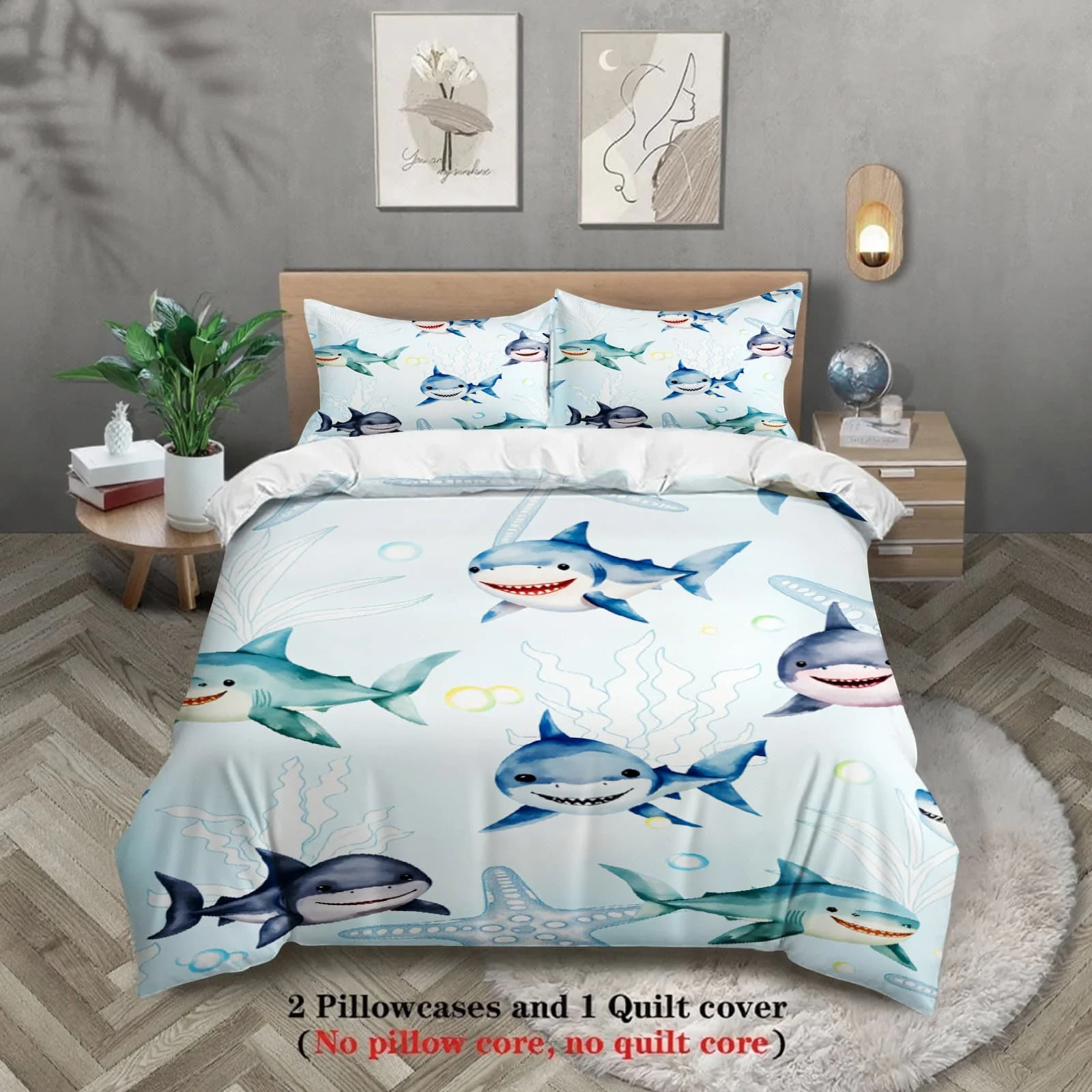 3pcs Cartoon Sharks in Ocean Print Duvet Cover Set – for Kids Gift 100%Polyester, Soft, Breathable for Bedroom Decoration