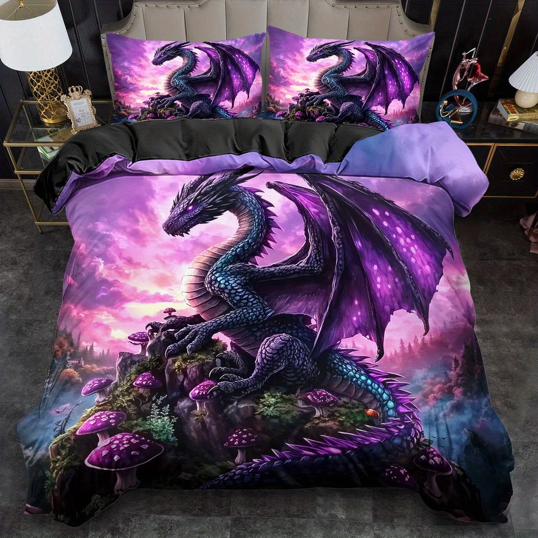 Cosmic Lunar Dragon Starry Sky Moon Purple Blue Dragon Bedding Set 3D Printed Fantasy Winged Dragon Duvet Cover Set for Bedroom