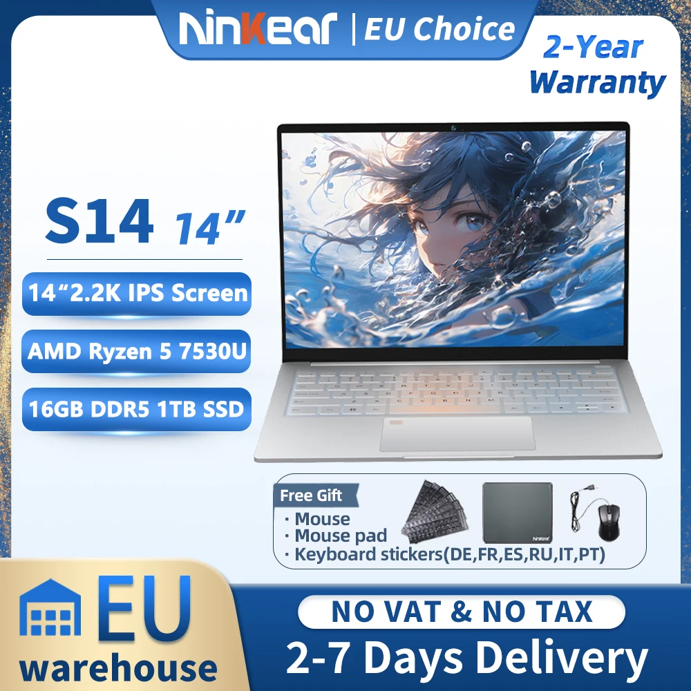 Ninkear S14 Ultra-portable Laptop With 1KG Weight AMD Ryzen 5 7530U 14 Inch 2.2K Windows 11 16GB LPDDR5 1TB SSD Computer Type-C