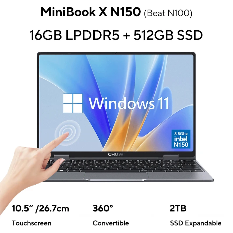 CHUWI 10.51-inch Touchscreen Laptop 12th Intel N150 Up to 3.6GHz 16GB LPDDR5 512GB SSD Convertible Computer Windows 11 Tablet PC