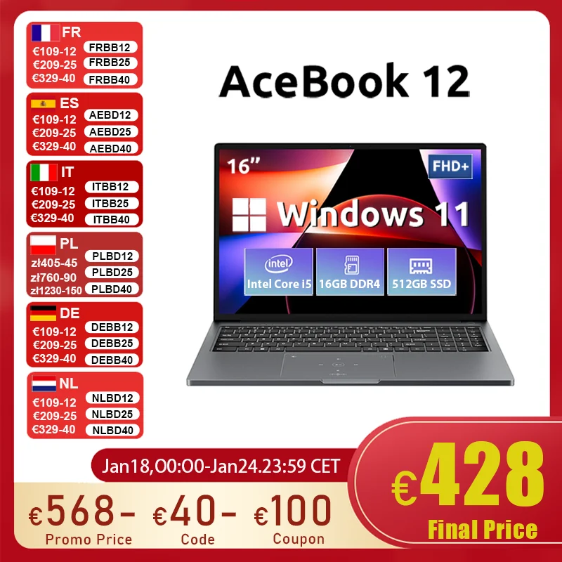 Blackview AceBook 12 Laptop 16'' FHD IPS, Intel I5-1030NG7 Win 11 Notebook, 16GB RAM 512GB SSD, 2-in-1 Fingerprint Power Button