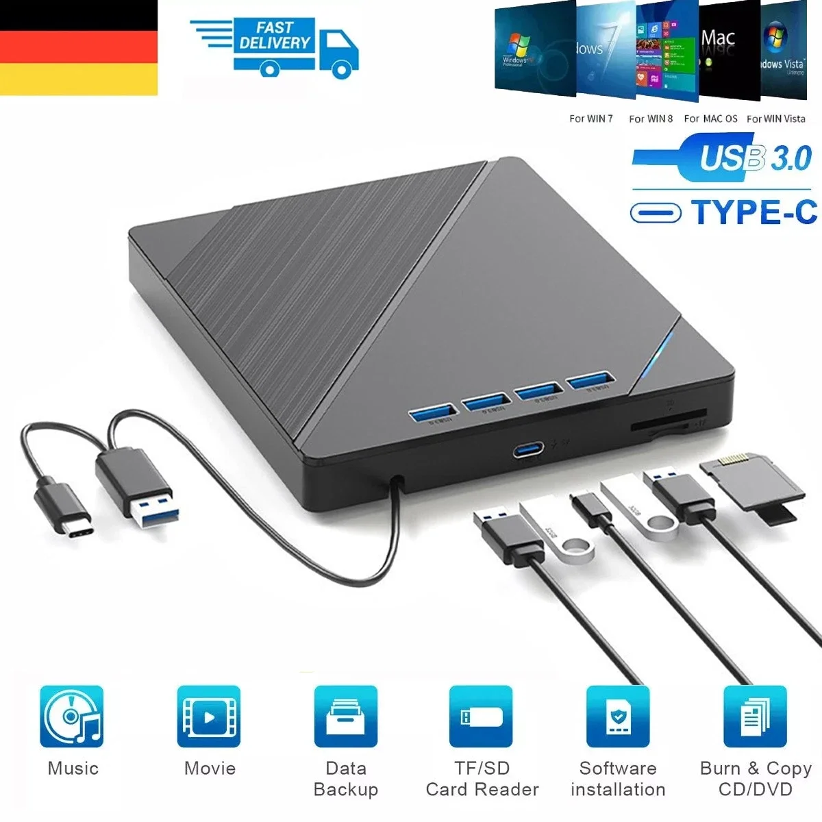 7-in-1 USB 3.0 Type C TF External CD DVD RW Optical Drives DVD Burner Recorder Reader Player Tray Type for PC Laptop Notebook