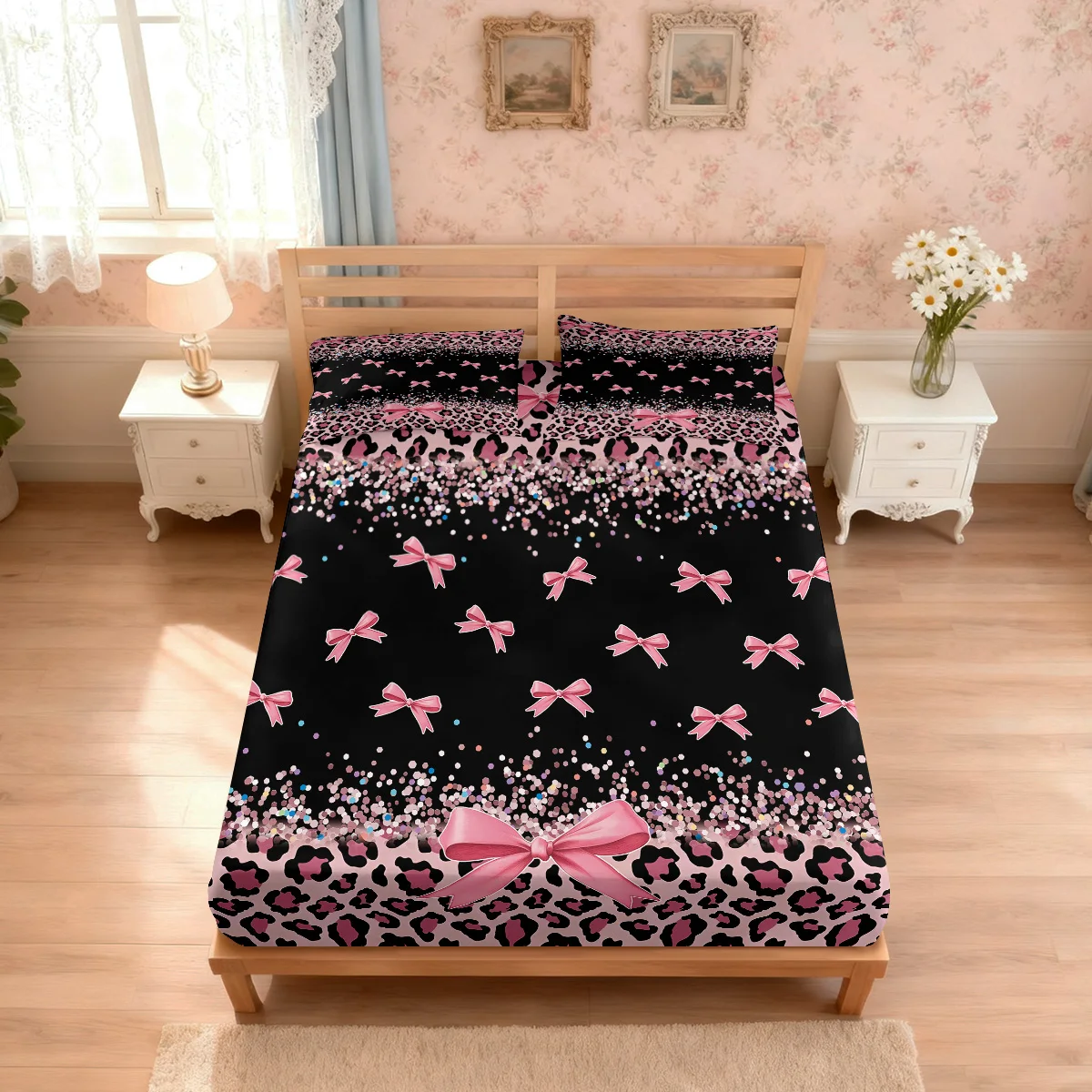 3pcs Leopard Print Bow Print Coreless Bed Sheet Set, Multi Size Comfortable Bed Cover, Bedroom Bedding Decoration