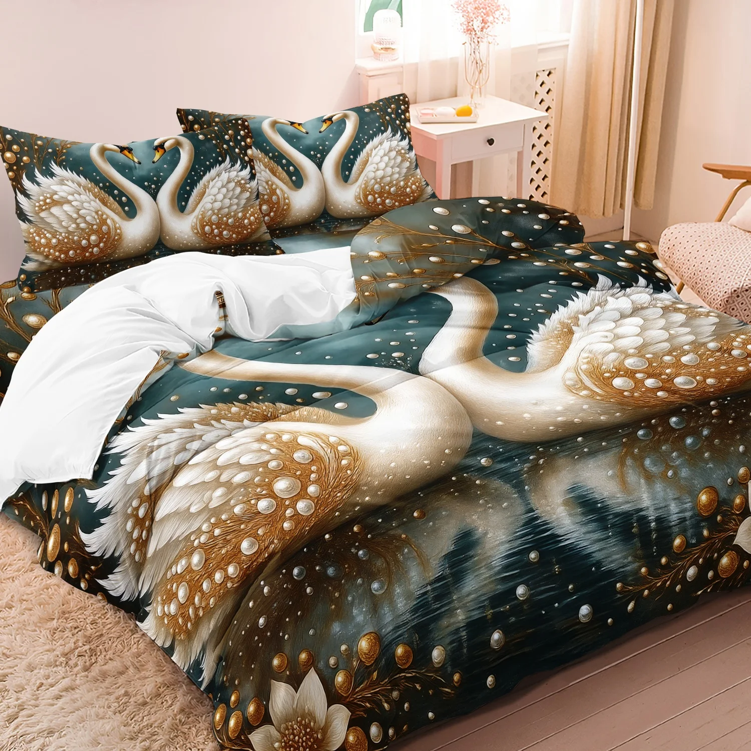 3pcs Crown Swan Gemstone Digital Printing Duvet Cover Set,Flower High-Definition Print Bedding Duvet Covers For Home And Dorm