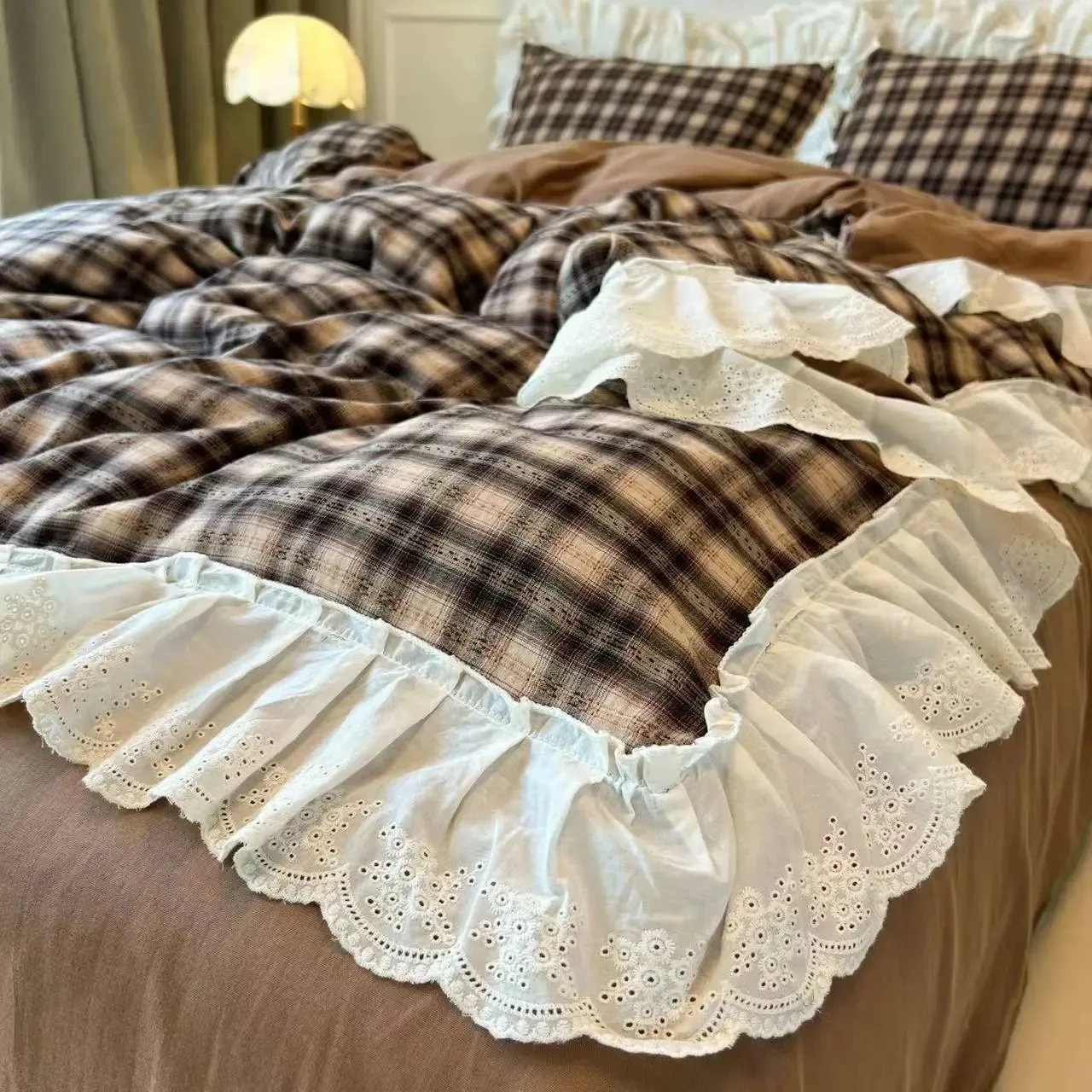 Korean-Style Red Plaid Washed Bedding Set - Vintage Lace Trim 4-Piece/3-Piece Dorm Sheet & Duvet Cover Set
