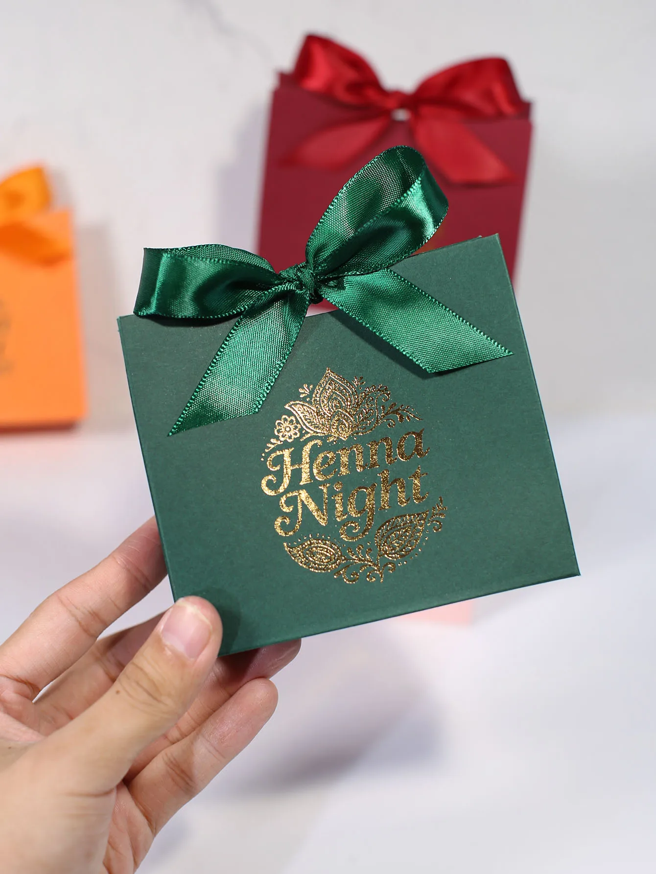Luxurious 'Henna Day' Dark Green Gift Boxes with Golden Ribbons, Ideal for Wedding Celebrations and Special Gift Giving