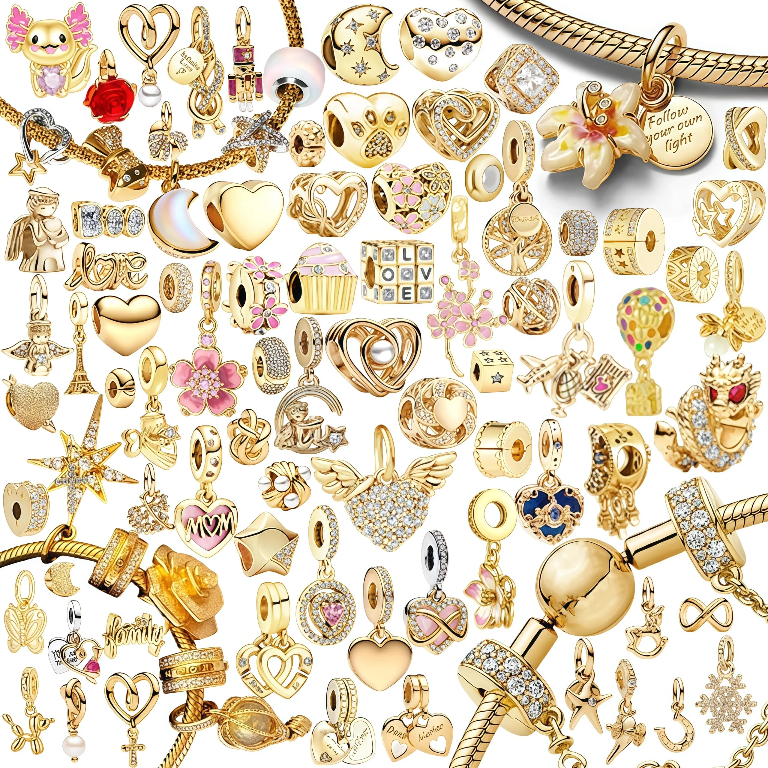 New DIY Gold Sparkling Flower Heart Series Dangle Charm Bead Pendant Safety Chain Fit Original 925 Sterling Silver Jewelry Gift