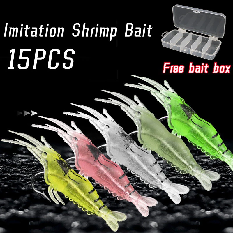 15pcs New PVC Shrimp Lures Multicolor Soft Luminous Shrimp Bait Set Fishing Lure With Sharp Hook