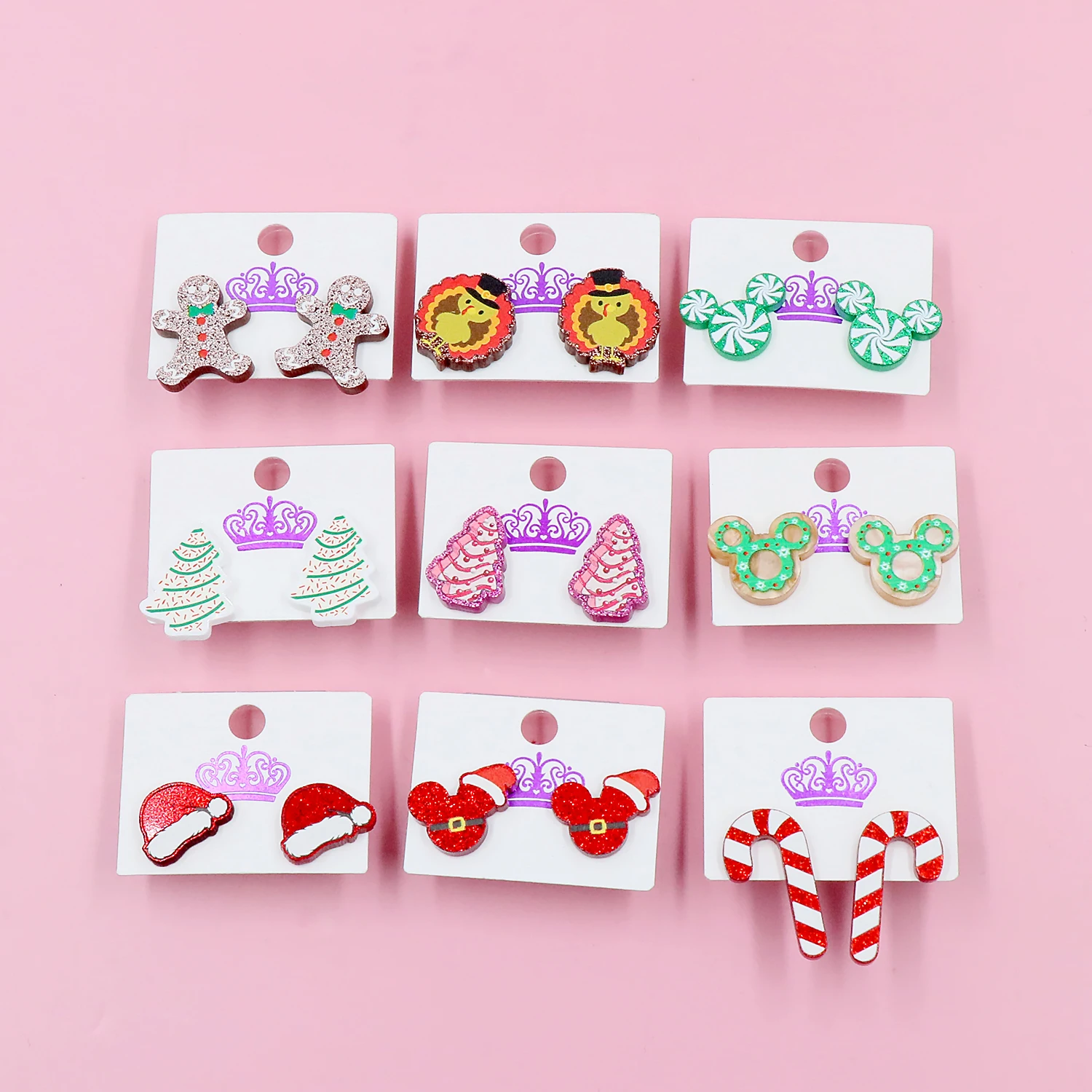 Custom Santa Hats Tree Mouse Head Turkey Glitter Acrylic Christmas Stud Earrings Stainless Steel Jewelry Wholesale