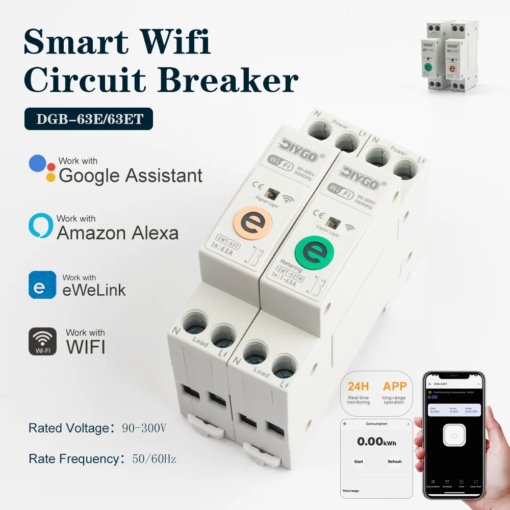 63A 1P+N Mini Din Rail WiFi Smart Switch Circuit Breaker Remote Voice Control Real-monitoring Work With Google & Alexa & Ewelink