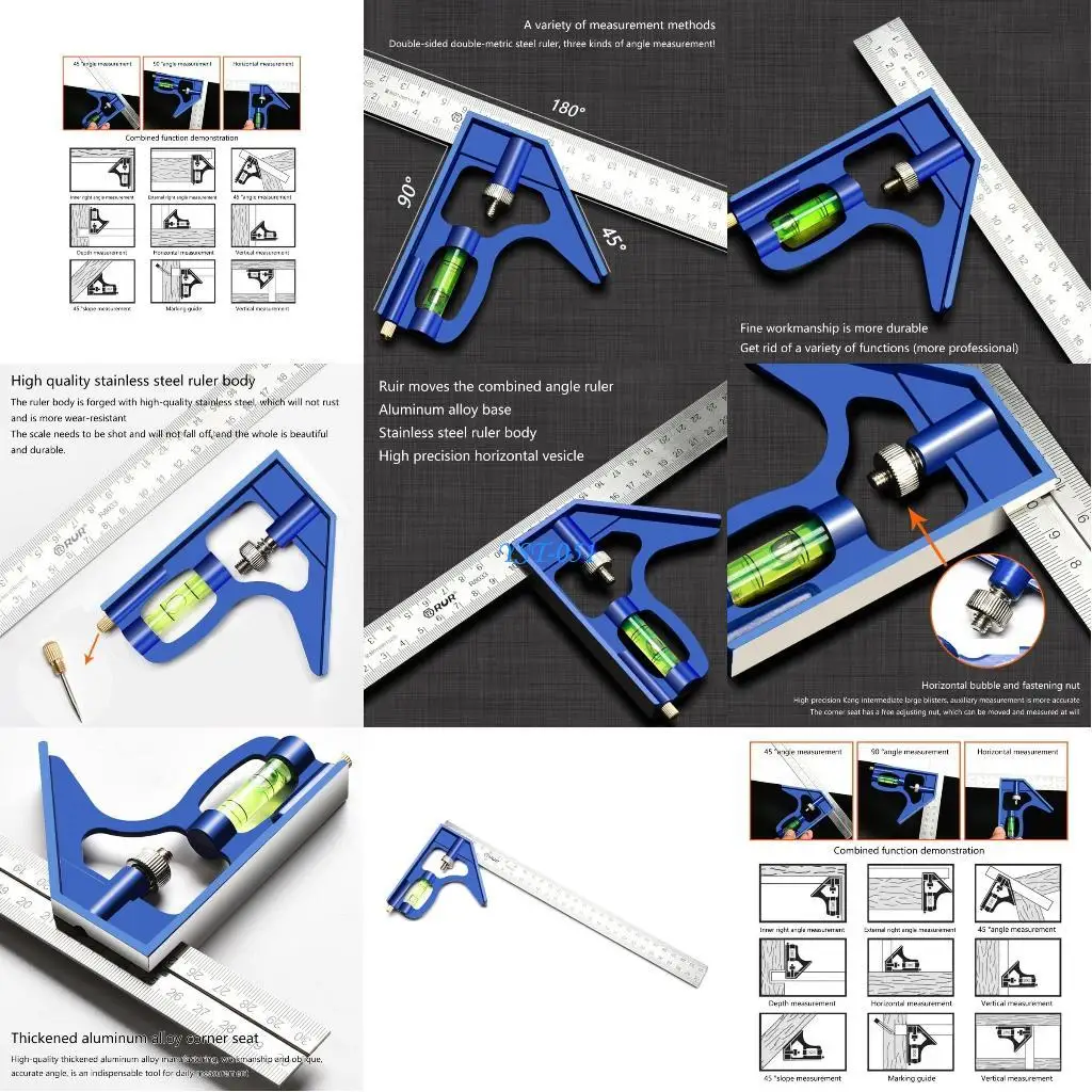 E15A Combination Square Woodworking Metal Stationery Drawing Ruler with Level