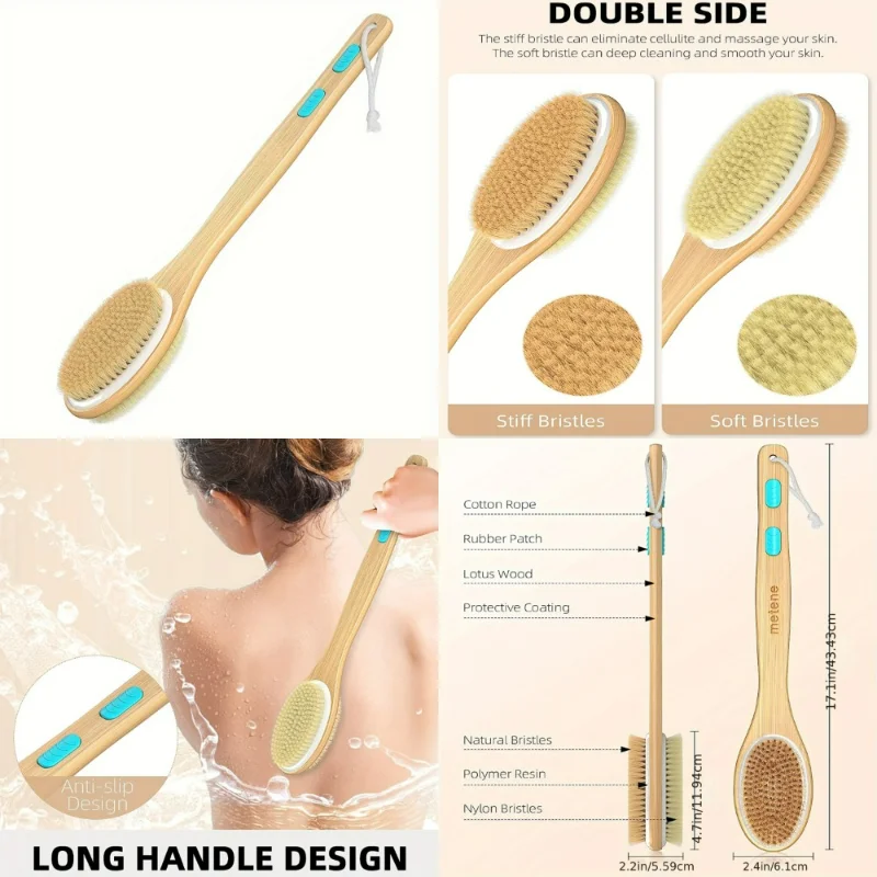 Refresh" Dual-Sided Long Handle Shower Brush - Soft & Stiff Bristles For Wet Or Dry Body Exfoliation, Nylon Fiber, Fragrance-Fre
