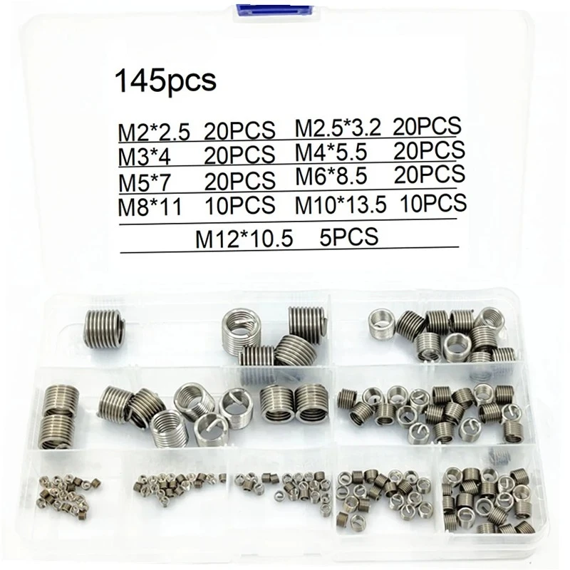 145pcs Helicoil Wire Thread Repair Inserts Kit M2 M2.5 M3 M4 M5 M6 M8 M10 M12 304 Stainless Steel Wire Thread Sleeve Bushing