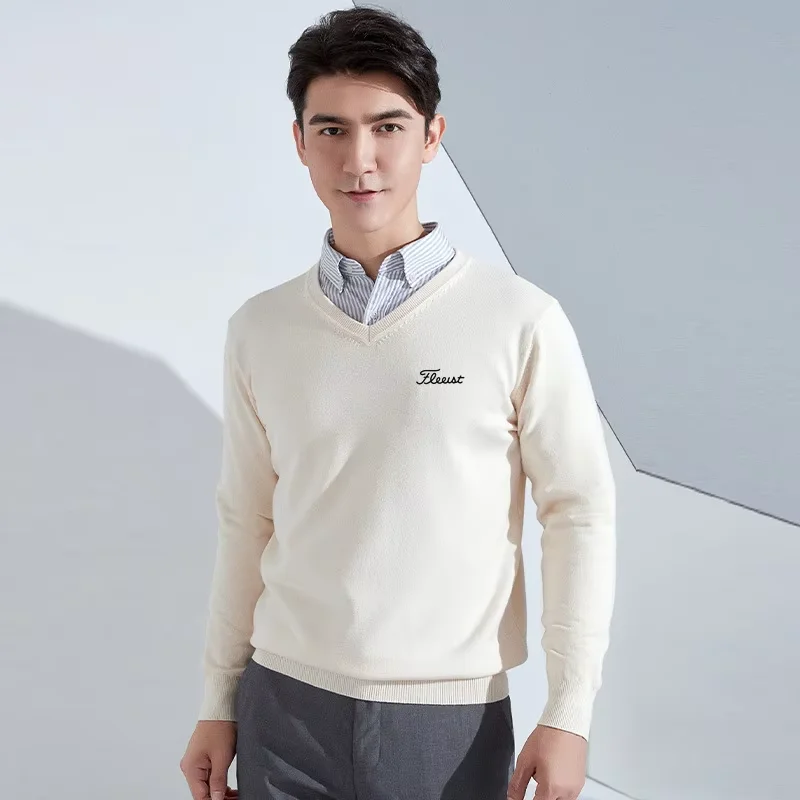 Men Golf Knitted Sweater Cashmere Cotton Blend Classic V-neck Knitted Top Men Pullover Soft Warm Business Casual Golf Clothing