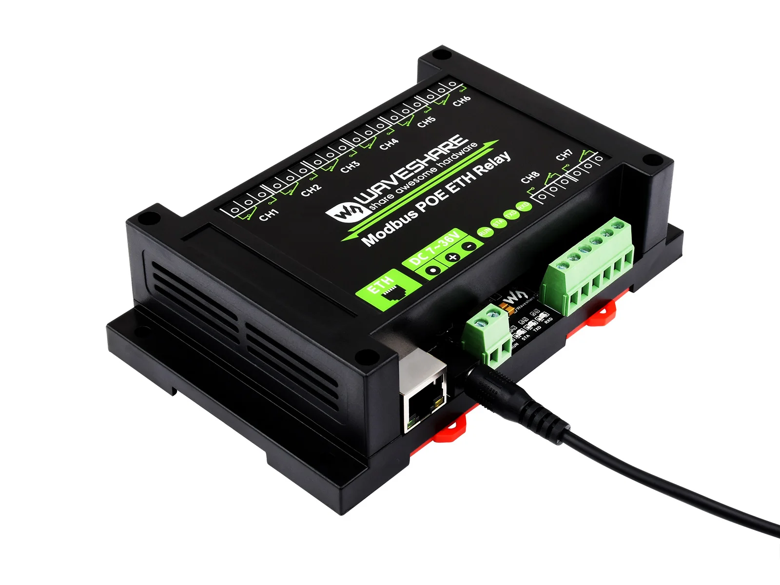 Waveshare Industrial Grade 8-ch Ethernet Relay Module, Ethernet Port Communication, Modbus Protocol, PoE Power Supply