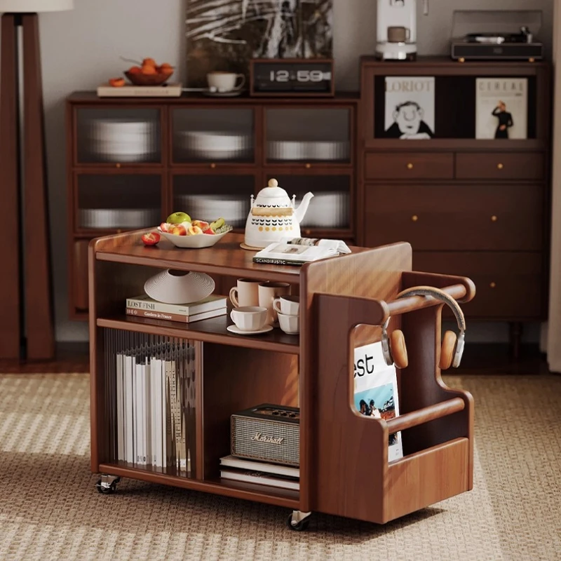 Movable Height Adjustable Side Table Sofa Living Room Household Cabinet Storage Rack Solid Wood Coffee Trolley Lounge Furniture