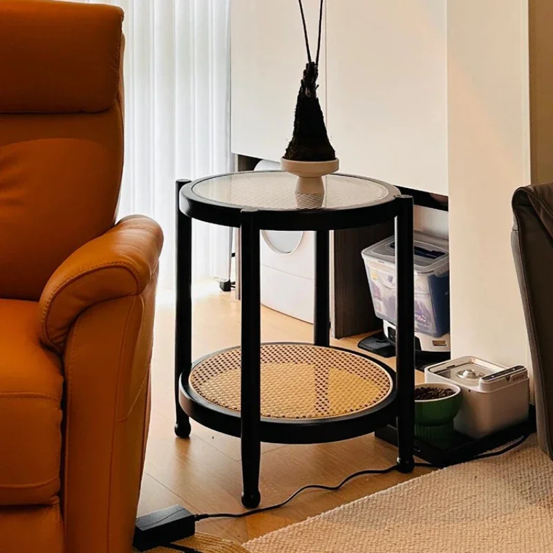 Nordic Rattan Side Table Glass Solid Wood Lounge Coffee Living Room Japanese Double-layer Apartment Round Meubles Furniture