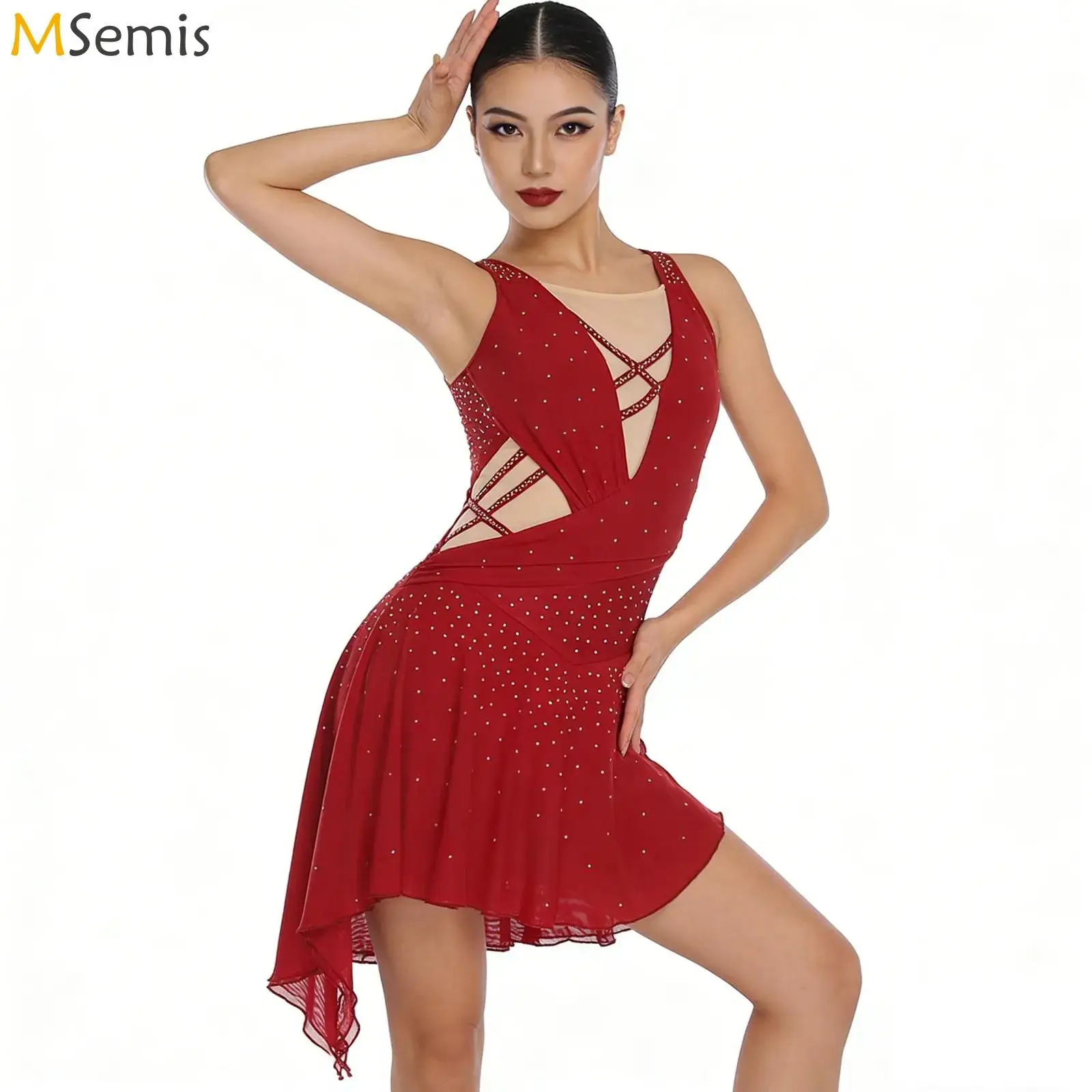Womens Figure Skating Costume Chacha Samba Rumba Latin Dance Bodysuit V Neck Ruched Mesh with Rhinestone Backless Leotard Dress