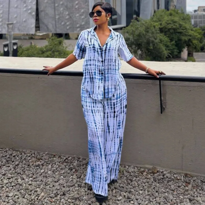 Women Two Piece Sets Pant Set Turn Down Collar Short Sleeve Shirt Wide Leg Long Pants Elastic Waist Y2k Streetwear Casual Loose