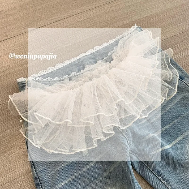 1PC Mesh Lace Mini Skirt Ruffles Y2K Streetwear Ruched Skirts Harajuku See Through Waist Pleated Skirts Jeans Decoration