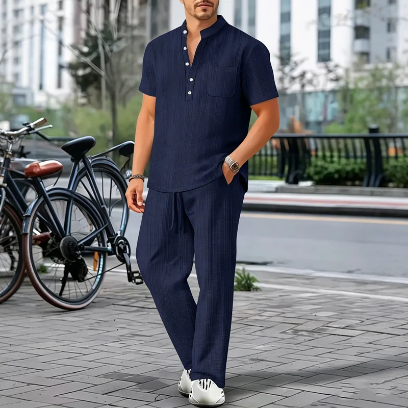 Men's 2 Piece Outfits Textured Henley Shirt Drawstring Pants Set Casual Breathable Summer Daily Wear Vacation Tracksuit for Men