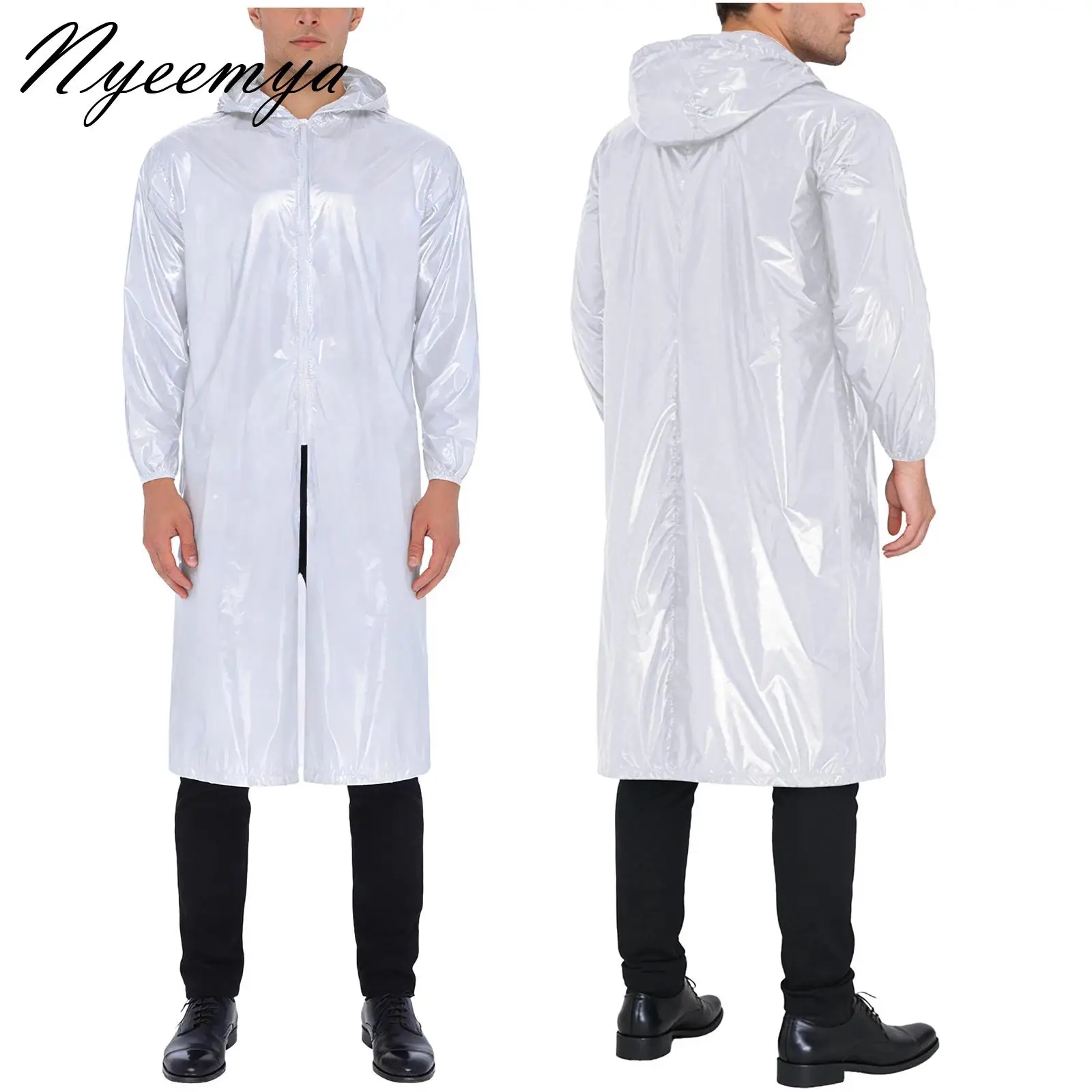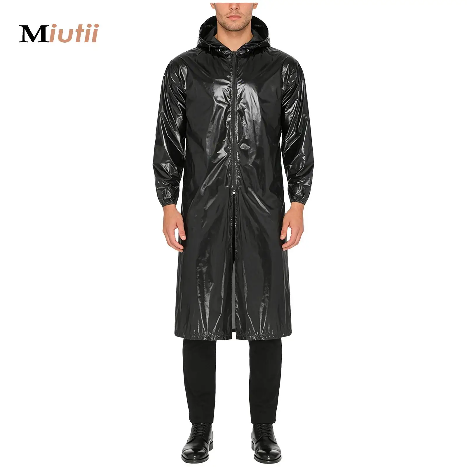 Mens Waterproof Hooded Long Jacket Long Sleeve Front Zipper Lightweight Raincoat Workwear Travel Hiking Camping Rain Poncho