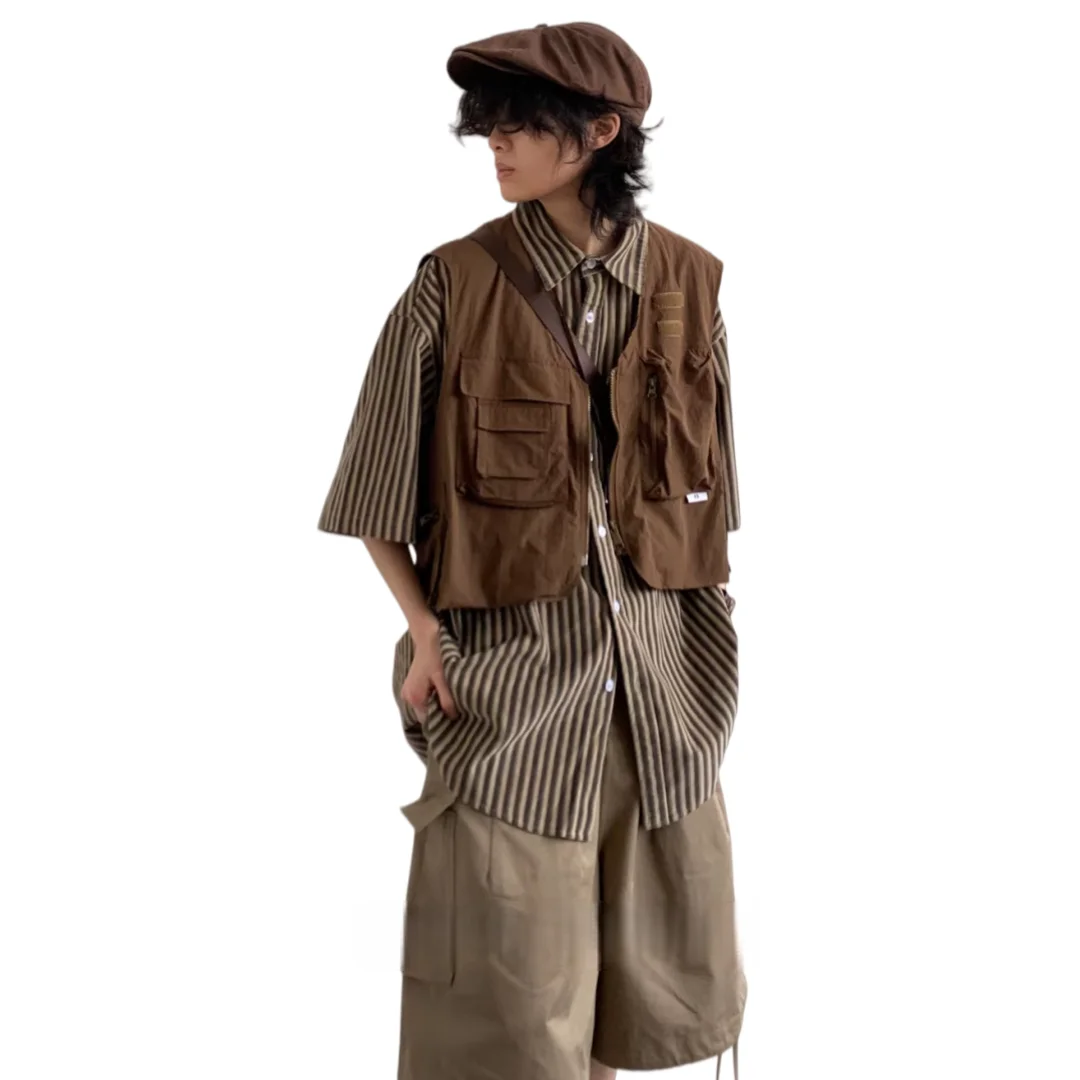 2026 New Summer Japanese Retro Short Coffee Cargo Vest Men Women Casual College Style Photography Functional Sleeveless Jacket