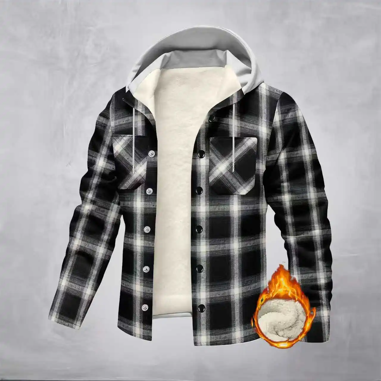 Men's Fashion Long Sleeve Fleece Lined Plaid Hooded Jacket Autumn Winter New Style Casual Streetwear