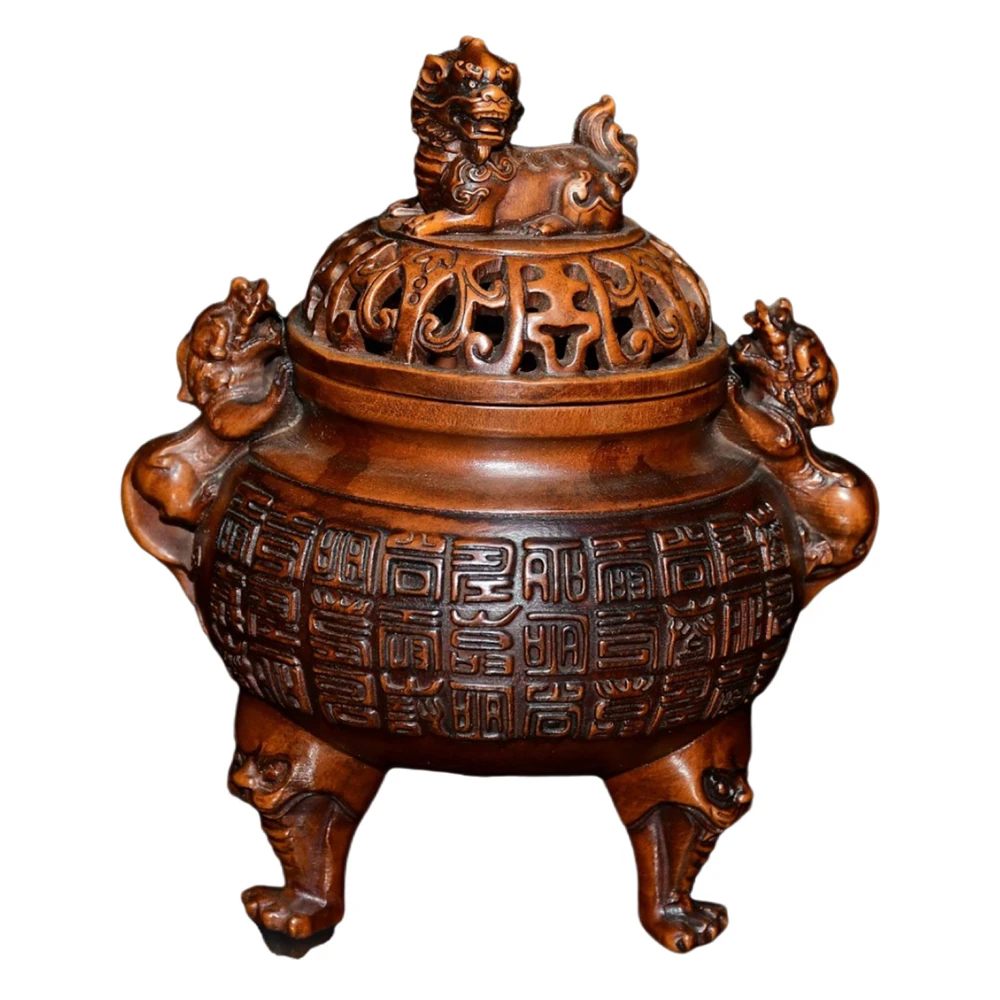 Vintage Boxwood Carving Incense Burner Wooden Censer Mythical Beast Oriental Handcarved Tripod Decor Protection Blessing Harmony