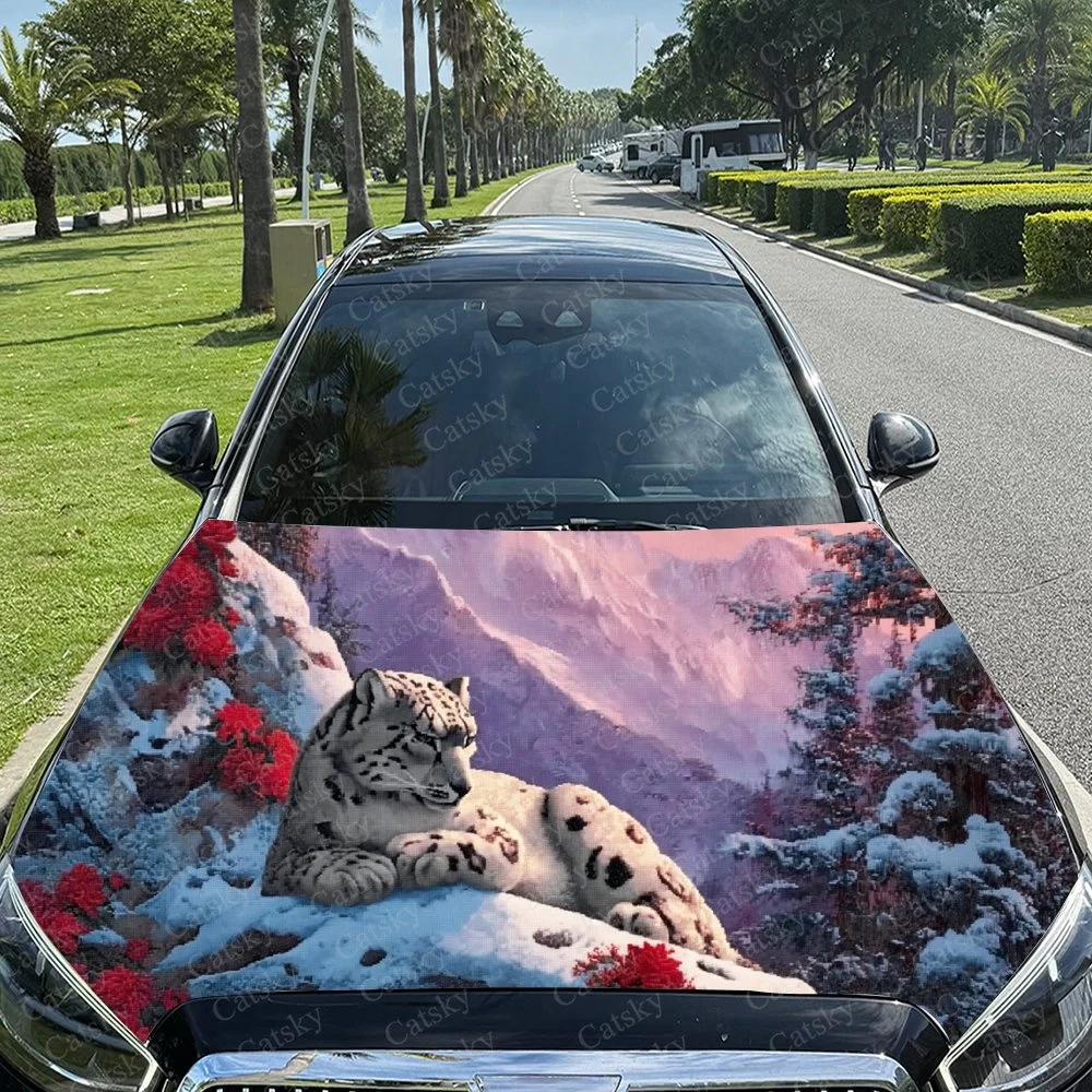 Snow leopard rests peacefully in snowy mountains, vibrant red flowers bloom nearby, serene winter wilderness scene.Car hood stic