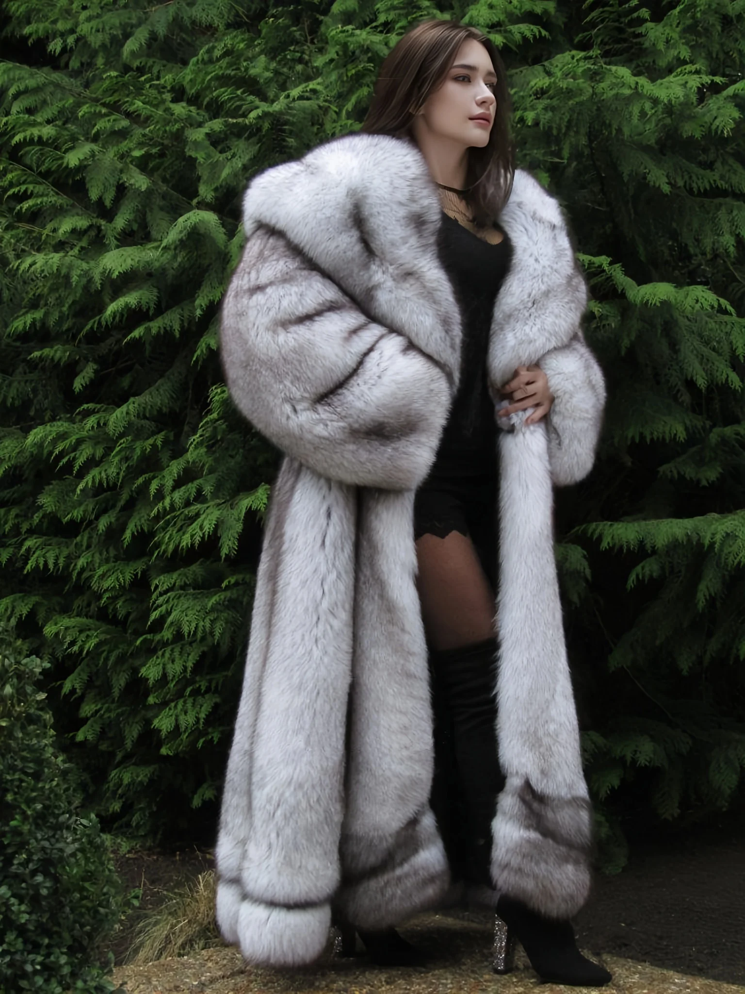 Women's Gradient Silver Fox Pattern Faux Fox Fur Hooded Coat Winter Long Length Fluffy Warm Luxury Jacket Daily Party Streetwear