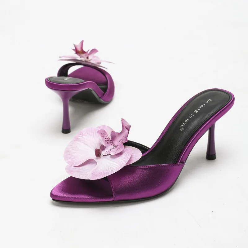 Flower Decoration Satin Luxury Heels Slippers for Women Peep Toe 2026 New Slides Ladies Pretty Vacation Designer Sandals Female