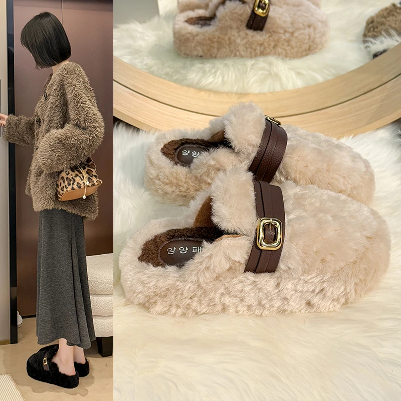Loafers Mules For Women 2026 Female Shoes House Slippers Platform Increased Internal Cover Toe Fur Flip Flops Slides New Plush