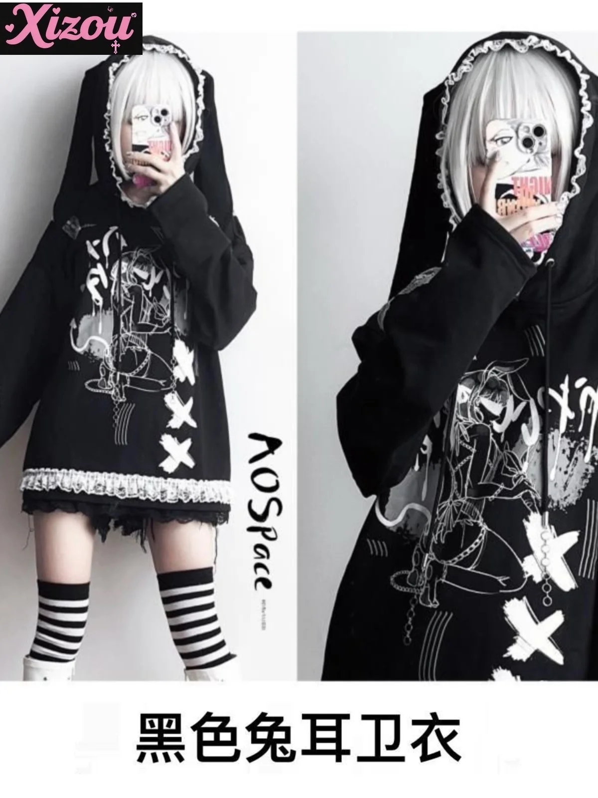 Spring Autumn Y2k Yabi Wind Culture Comic Wind Sweet Cool Spice Girl Black White Rabbit Ears Hooded Sweater Jacket Top Female