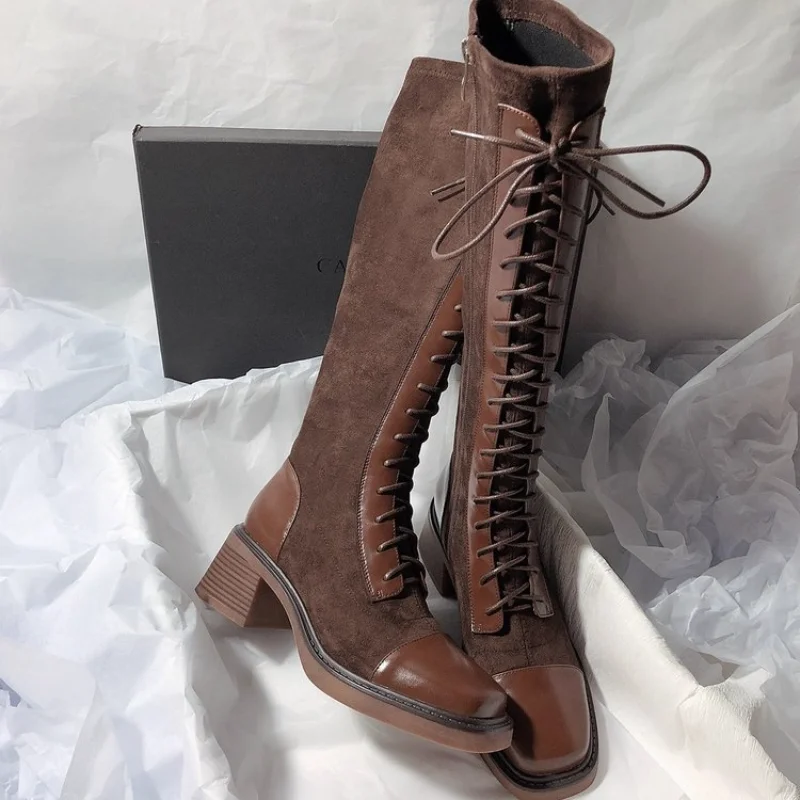 5.5CM Coarse Following Women Boots Leather splicing fashion Winter Shoes Cross tied Side zipper Knee-High Boots Motorcycle Boots