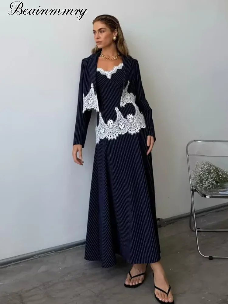 Women Striped Lace Patchwork Skirt 3-piece Set Elegant Sling Top Thin Blazer Maxi Skirt Sets 2026 Spring New Lady Party Outfit