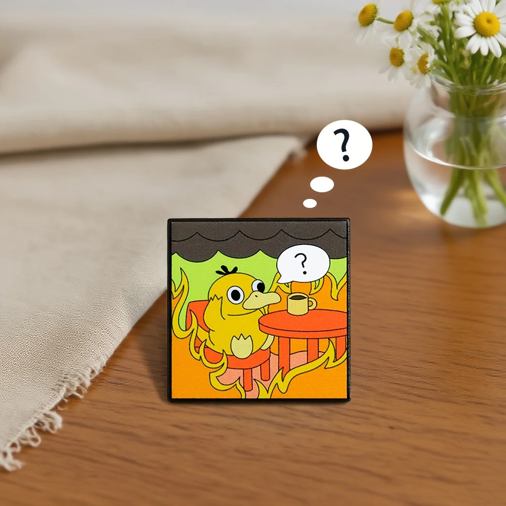 Cute Anime Duck Enamel Pin - House on Fire Design with Confused Duck - Brooch Jewelry Gift for Anime Fans, Funny Animal Badge