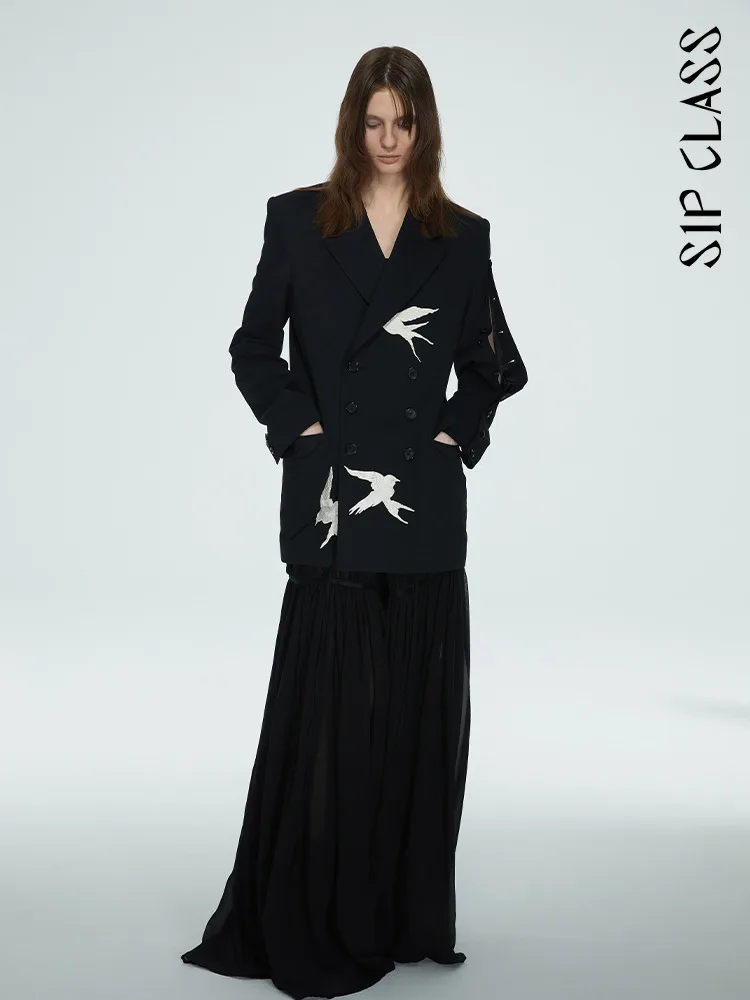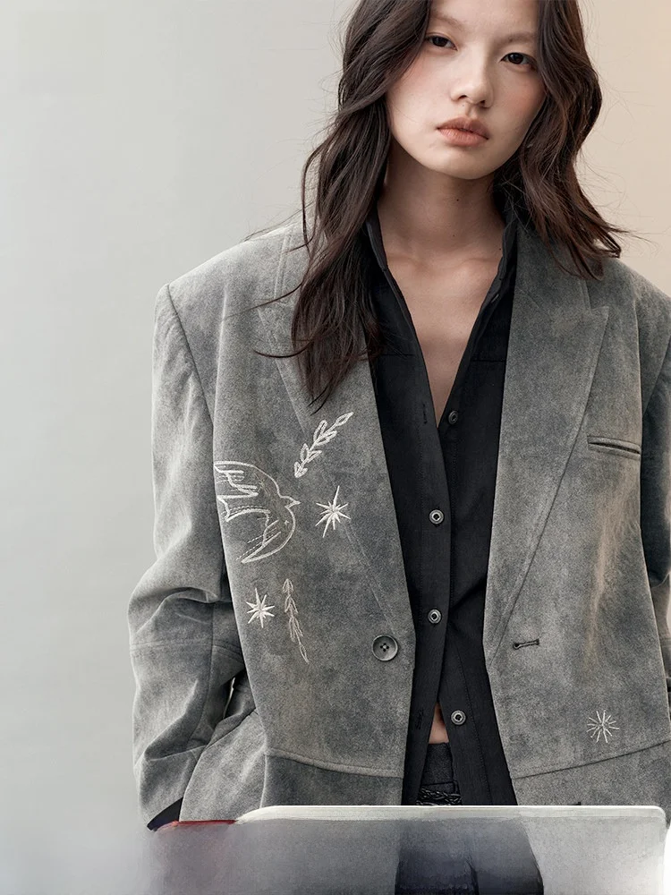 Ele Embroidered Loose Leather Jaet Women's Casual Small Suit Outerwear Bird Flight Design Faionable Commute Sle