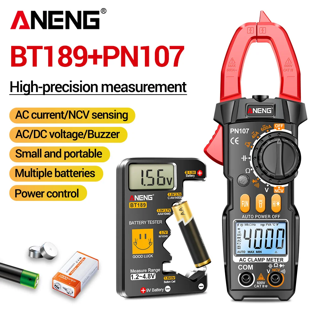 ANENG PN107 Digital Clamp Meter Multimeter Tester 600A AC Current AC/DC Voltage+BT189 Battery Detector Electrician Tools Kit