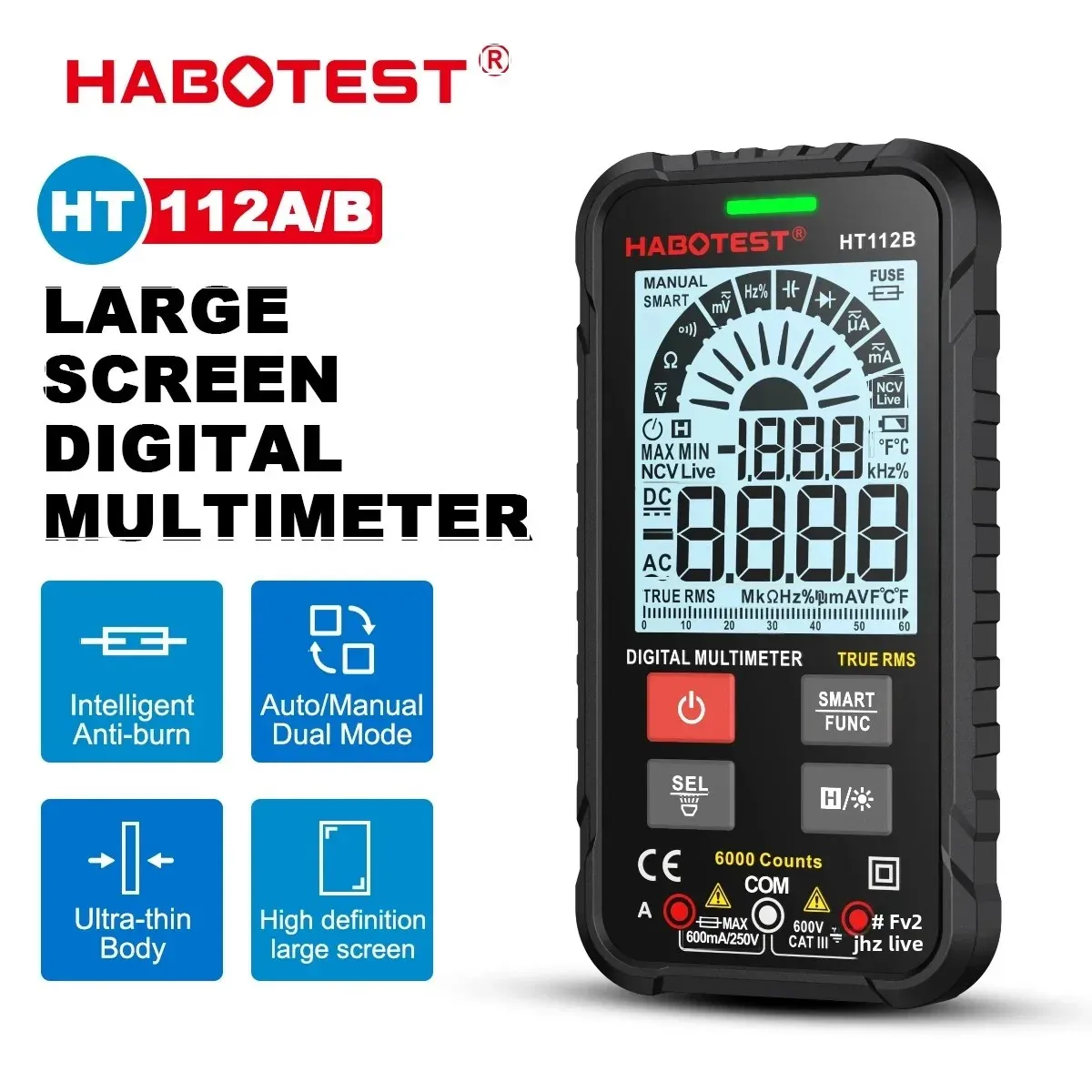 HABOTEST HT112 Digital Multimeter 6000 Counts Multimetro True RMS Professional Tester Auto Range AC DC Ohm Hz Tools Electrician