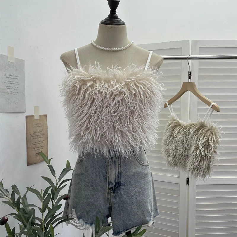 Furry Patchwork Svel Strap Top Hot Girl ort Sle Ba Performance Vest Women Trendy Knitted Thin Autumn Crop...