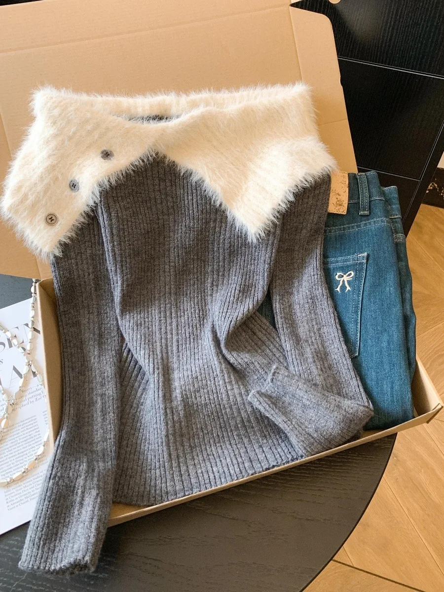 Girls Long Sve Knitted Sweater Soft Furry oulder Bared Inner Wear Thiened Winter Color Casual Sli Knit Top