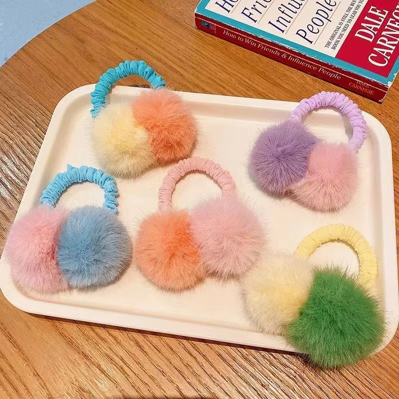Fashion Simple Sweet Candy two-color Pompom Hair Ring Elastic Hair Rubber Bands Cute Plush Hair Rope Soft Warm Furry Head Rope